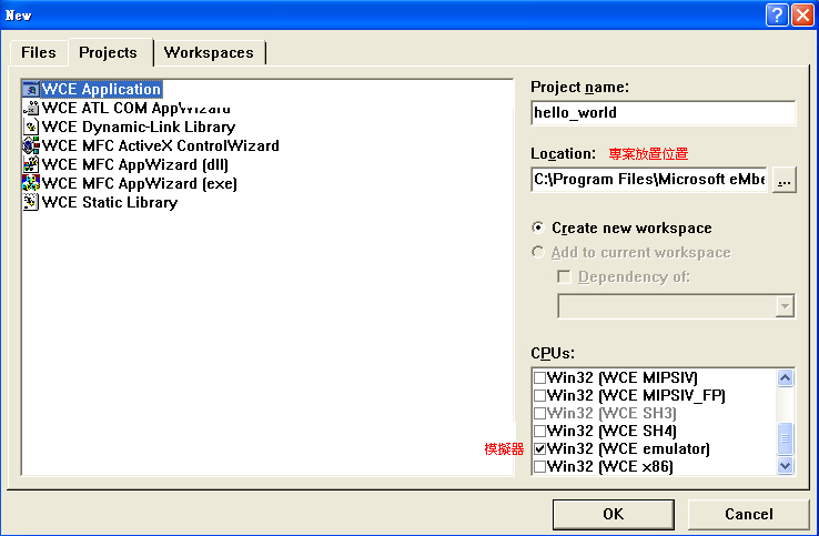 2. 選擇Projects中的WCE Application (以Win32為基礎的Windows CE應用程式), 在CPU選項中選擇WCE Emulator作為測試平台, 按OK