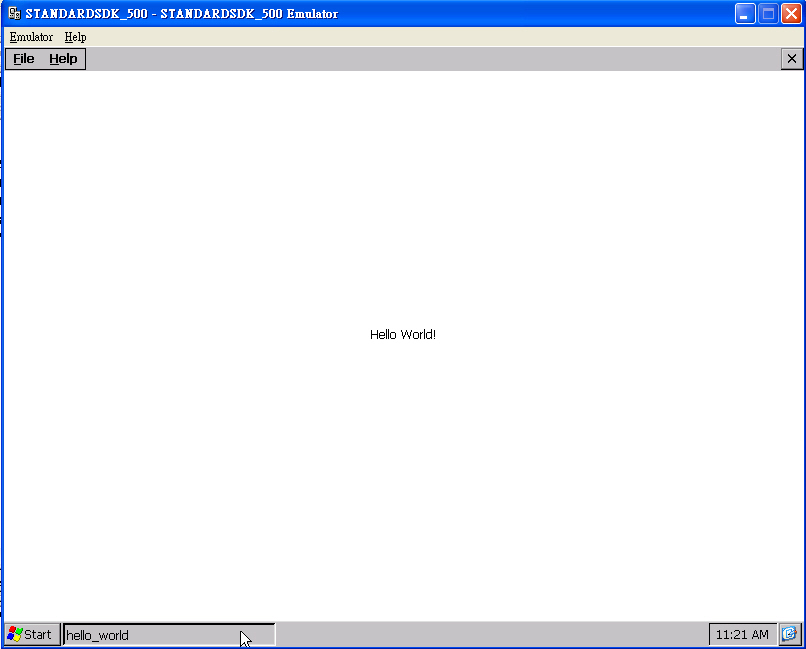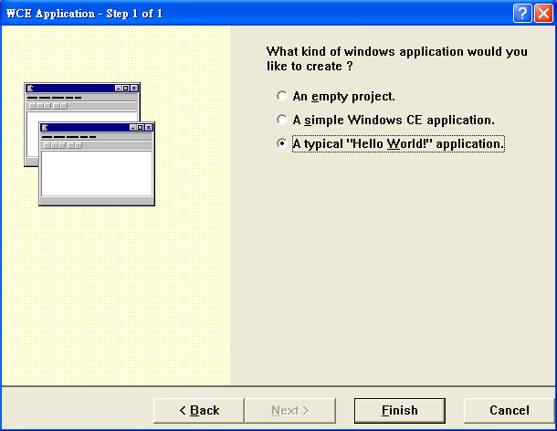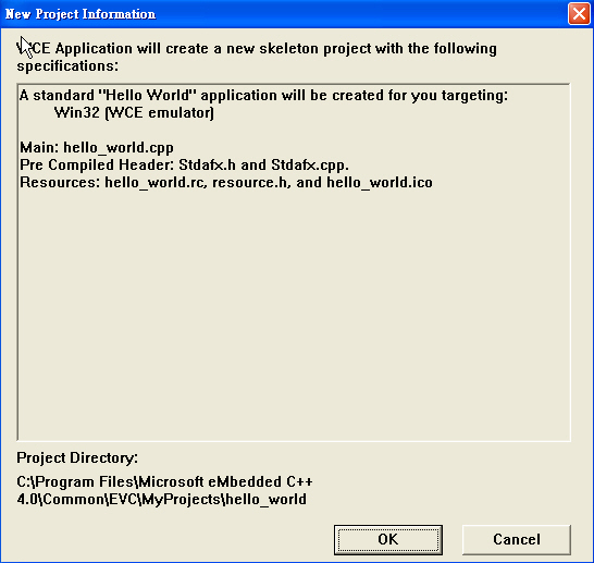 使用EVC++建立一個簡單的hello world應用程式, 然後在EVC++所提供的模擬器(emulator)下測試執行的結果