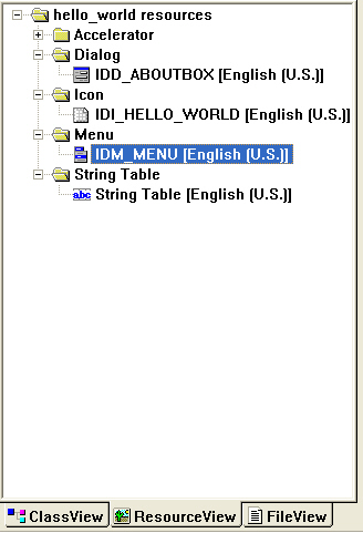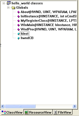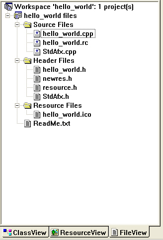 5. Hello world程式建立完成, 我們可以選擇ClassView, ResourseView, FileView分別觀看程式的內容,