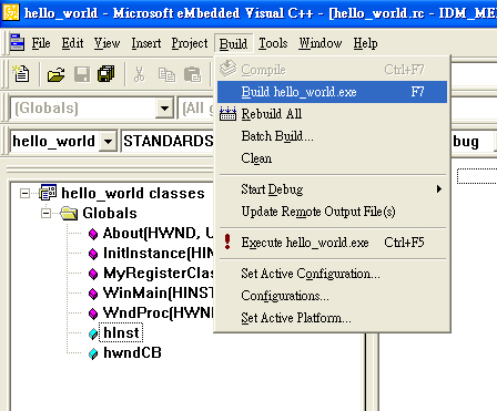 6. 選擇在Menu列中的Build--> Build hello_world.exe