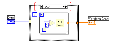 當 Enum控制項選擇cos時, caes結構會執行selector label "cos"的程式內容,將結果傳到Waveform Chart顯示器