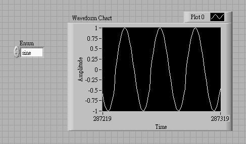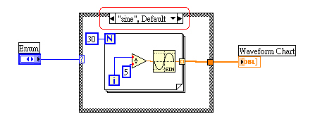 當 Enum控制項選擇sin時, caes結構會執行selector label "sin"的程式內容,將結果傳到Waveform Chart顯示器