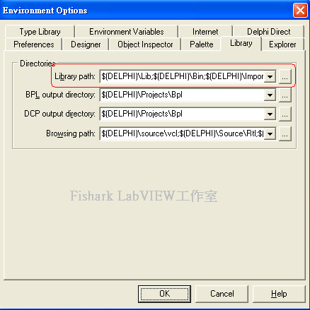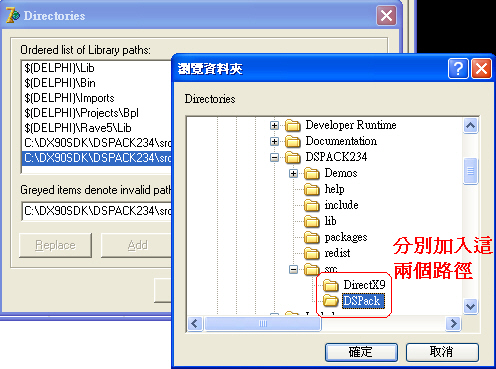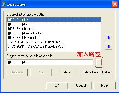 在Tools->Envioronment Options->Library. 在Library Path處添加(DSPackDir)\src\Directx9 與(DSPackDir)\src\DSPack 這兩個路徑。