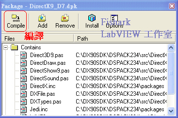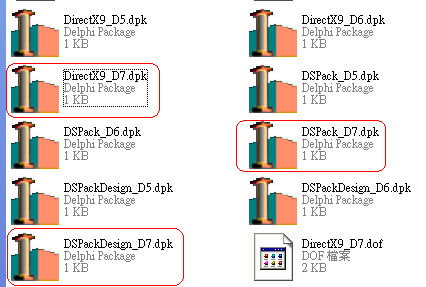 到DSpack的資料夾中的package資料夾, 編譯DirectX9_Dx.dpk(x為Delphi版本號),如我的版本是Delphi 7,那我就要編輯DirectX9_Dx.dpk。