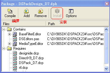 編譯DSPack_Dx.dpr(x為Delphi版本號),步驟同DirectX9_Dx.dpk 。