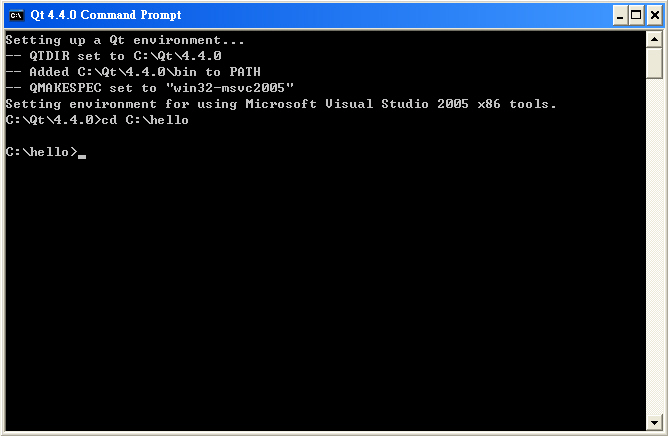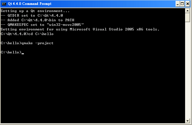 qmake -project =>生成hello.pro,告訴qmake與開發專案相關的souece與header檔的部份。