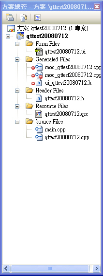 在專案總管的方案中,Form Files出現的qttest20080712.ui檔,