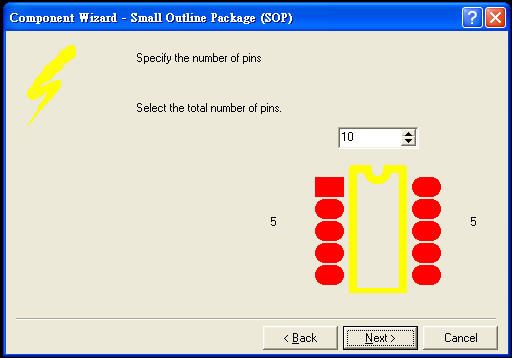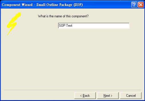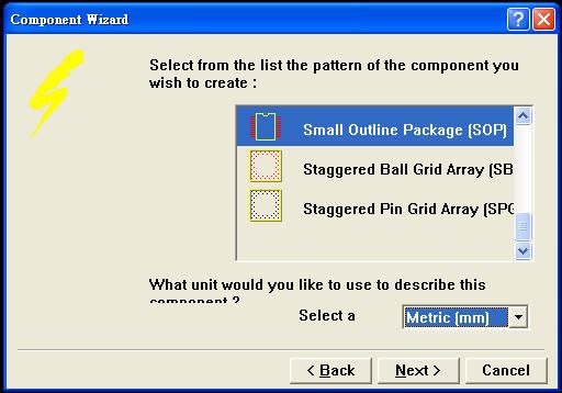 3. Component Wizard提供許多封裝格式,如DIP、SOP、電阻與電容等等,這裡我選擇SOP做一個介紹,這視窗的最底下可以選擇元件是要以英制或公制來顯示,