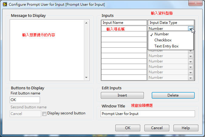 只要將設定對話視窗所需要的資料填入,就可以完成簡單的使用者資料提示輸入視窗的功能,