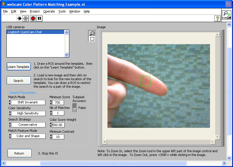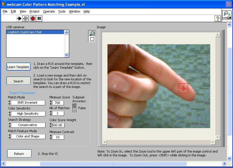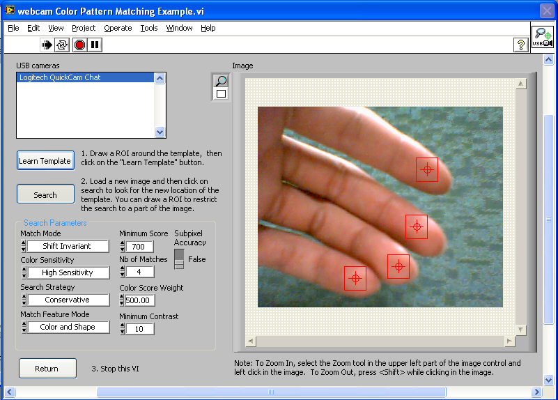 這一個程式是將webcam網路攝影機結合Vision module中的match color pattern的功能,來動態辨識膚色,