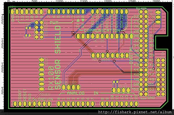 接著是印製版腳位拉線到感測器模組的腳位,定義模組在電路板中擺放的位置,黑色為Mega 2560的PCB版框,藍色為sensor 模組的PCB版框,