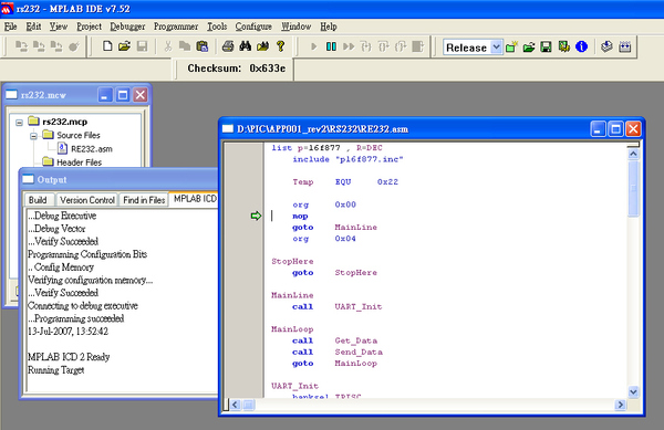 2. 然後將以下的程式碼使用MPLAB IDE進行編譯 與執行: (此程式的功用為將從電腦端輸入的值直接傳回去)