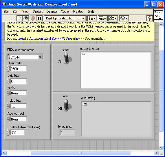 3. 使用LabVIEW提供的範例程式"Basic Serial Write and Read.vi"進行測試: