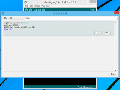 在Arduino IDE中,工具-->開發版-->開發版管理員,搜尋 ESP32,