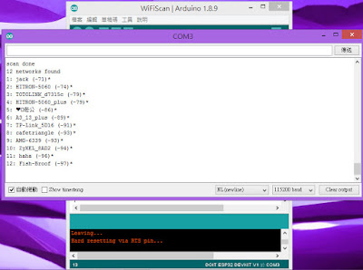 執行,開啟工具-->串列埠監控視窗,即可看到附近WIFI訊號的掃瞄資訊